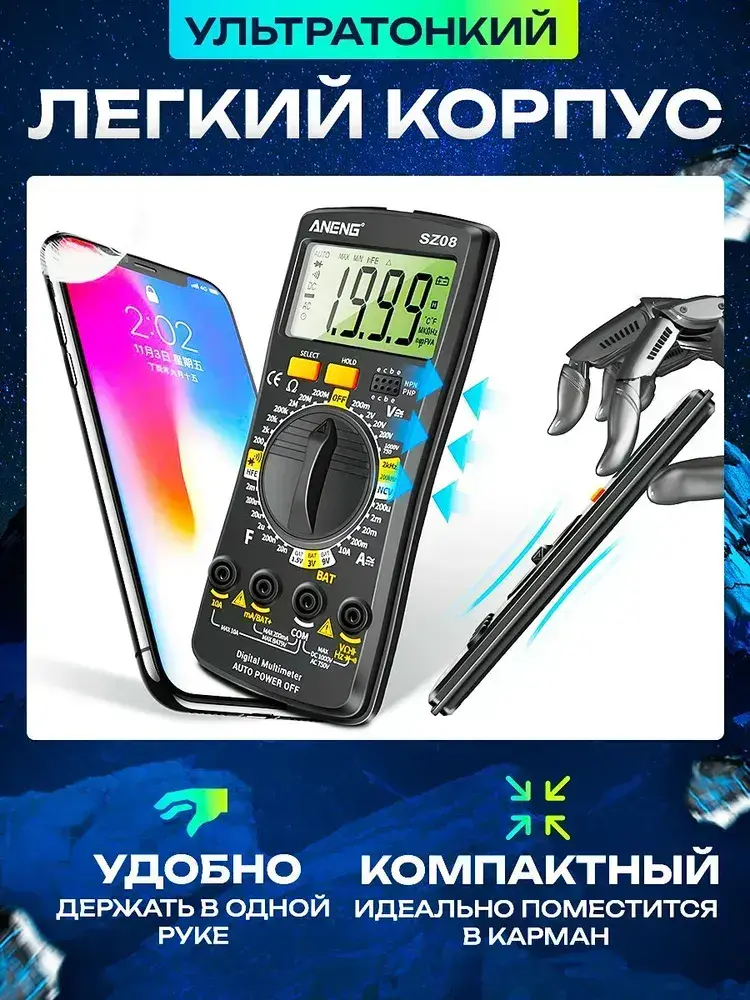Мультиметр тестер цифровой автоматический с щупами Aneng SZ08