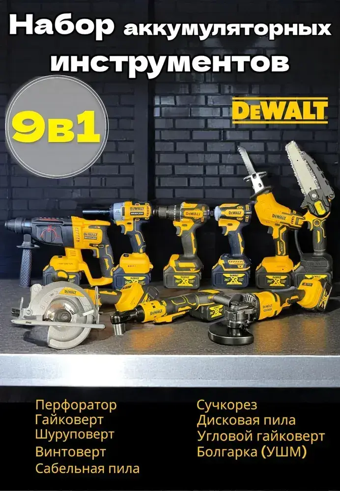 Набор электроинструментов 9 в 1 / Шуруповерт, Перфоратор, Гайковерт, УШМ (Болгарка), Цепная и Дисковая пила, Угловой гайковерт, Сабельная пила, Винтоверт