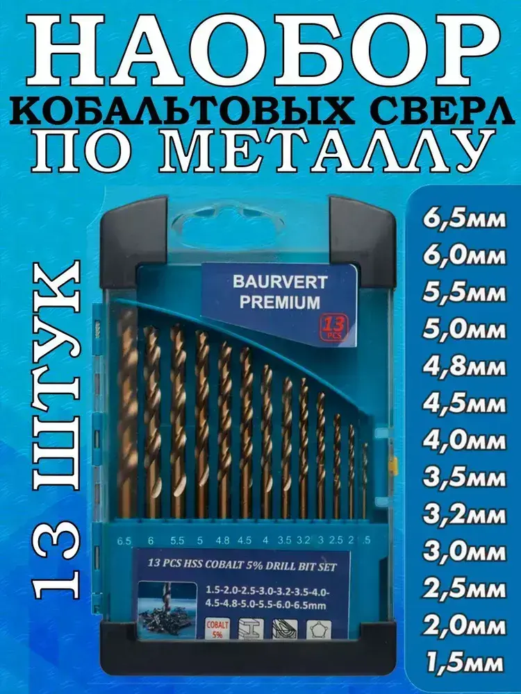 Набор кобальтовых сверл по металлу (1,5-6,5 мм.) 13 штук