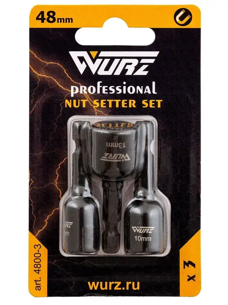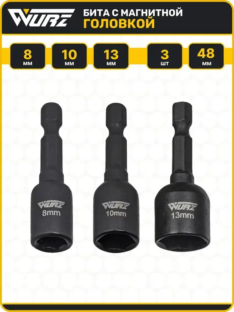 Набор торцевых магнитных головок для шуруповерта 8мм 10мм 13мм Длина 48мм 3шт. WURZ 4800-3