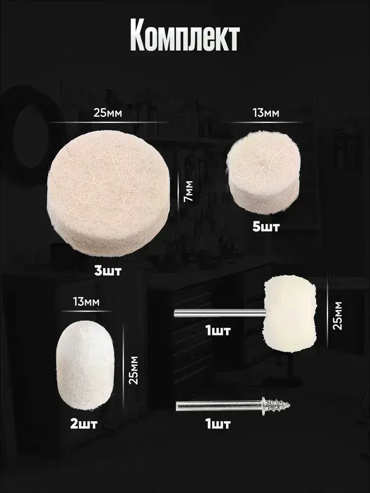 Насадки на гравер фетровые / Набор полировальных насадок для полировки для гравера и шуруповерта из войлока и фетра 12 шт