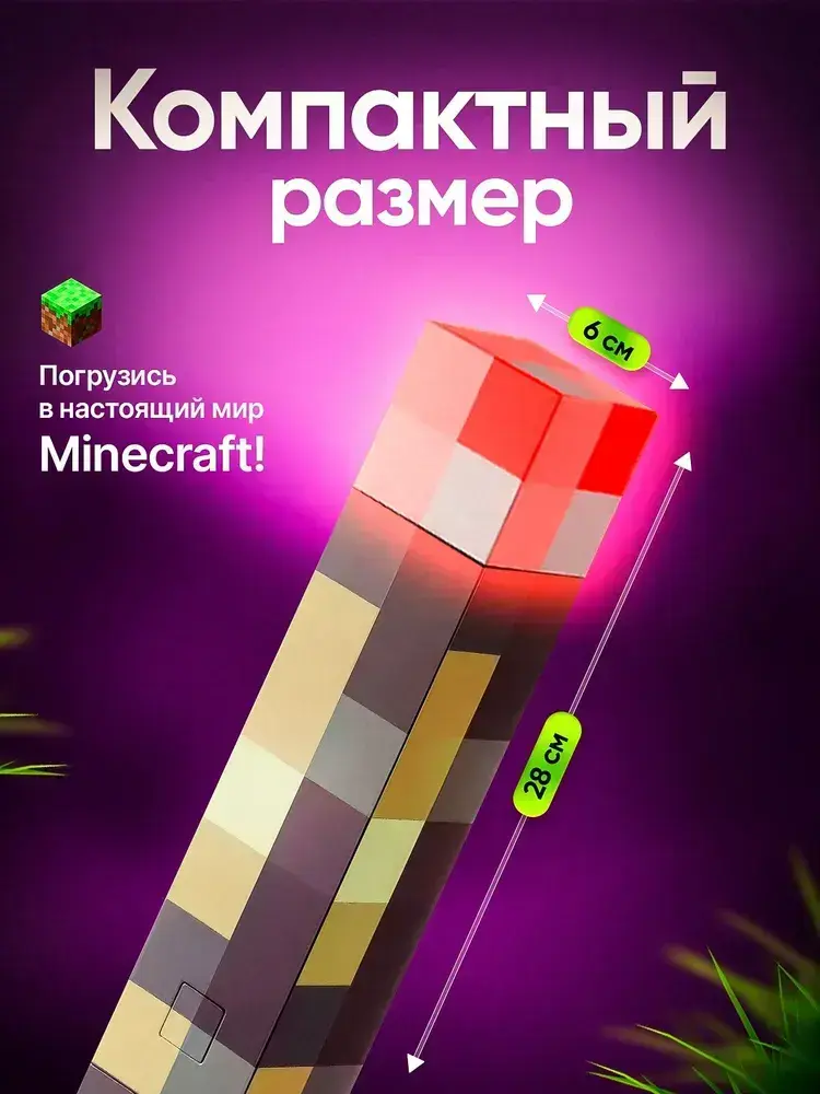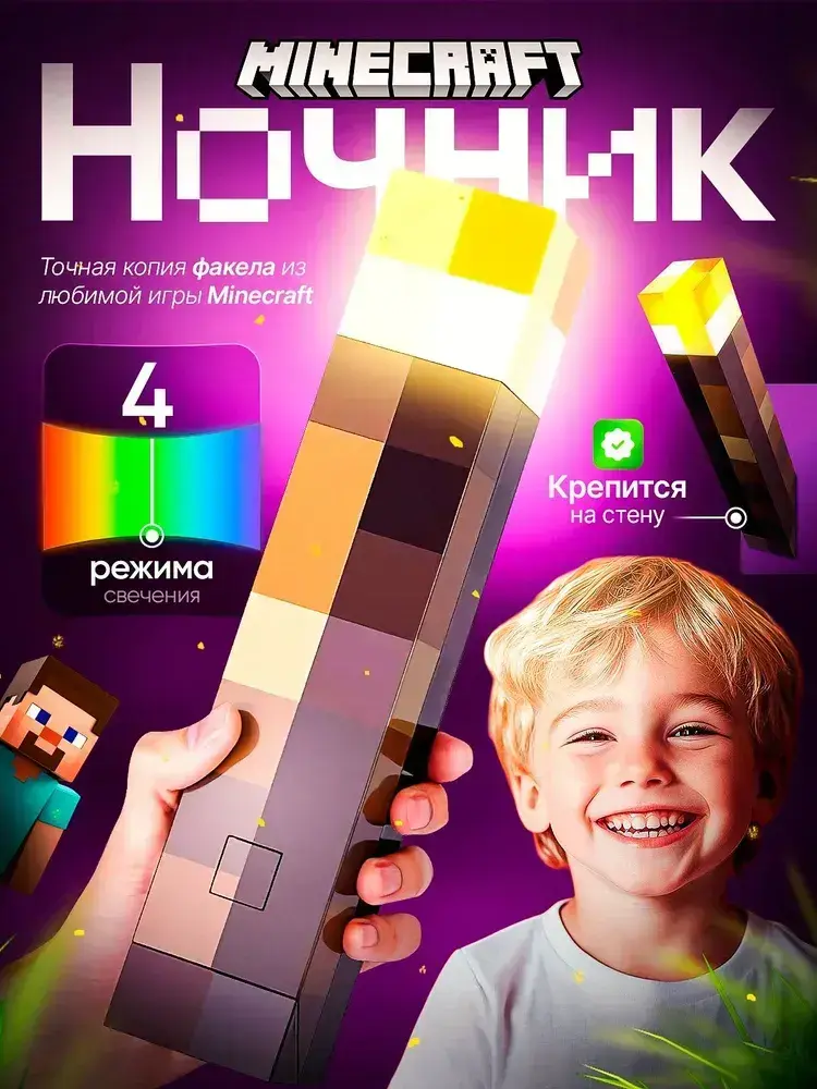 Ночник майнкрафт, светильник факел minecraft, 4 цвета беспроводной в детскую комнату