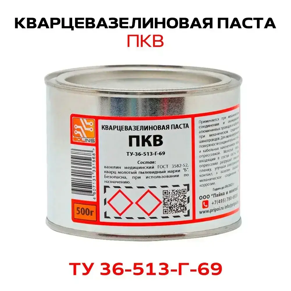 Паста кварцевазелиновая Solins ПКВ защитная для опрессовки жил, соединения проводов и кабелей, смазка для гильзы соединительной, вазелин, кварц молотый, защита от коррозии и окисления, 500 г