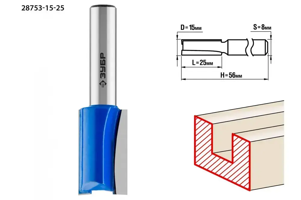 Пазовая прямая фреза ЗУБР 15x25 мм, хвостовик 8 мм 28753-15-25