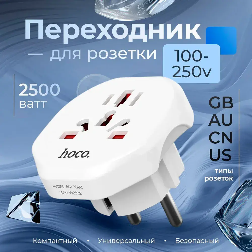 Переходник на евро вилку Hoco белый 10A 2500Вт / Сетевой адаптер универсальный на все типы вилок / С заземлением
