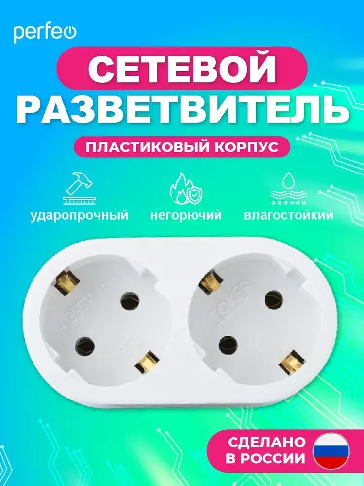 Perfeo сетевой разветвитель "RU POWER'' 2 гнезда, 16А, с заземлением, белый (2Т2)