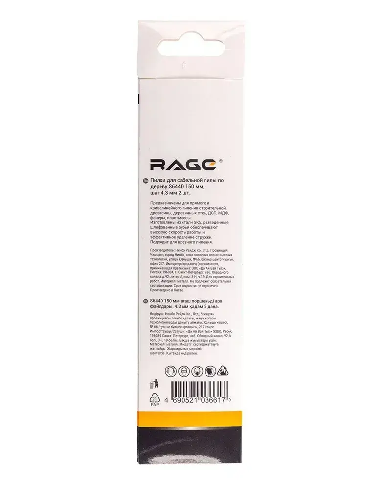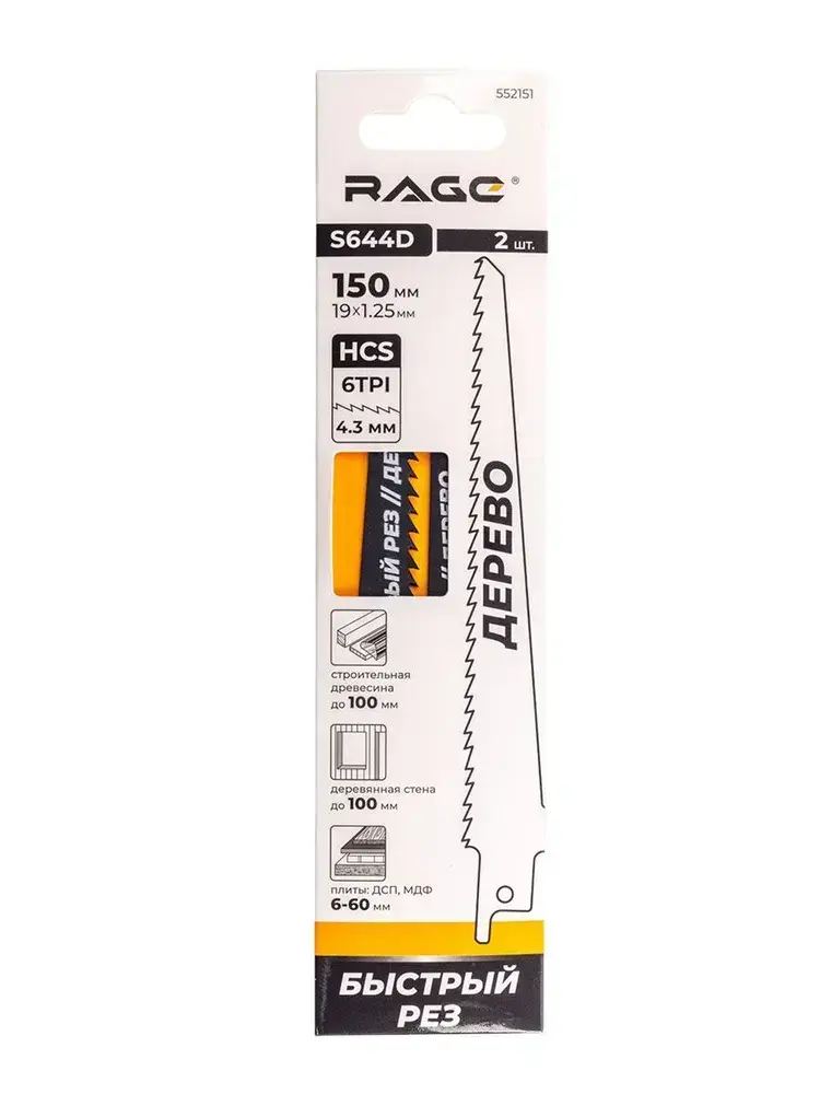 Пилка для сабельной пилы по дереву S644D 150 мм шаг 4.3 мм 2 шт RAGE