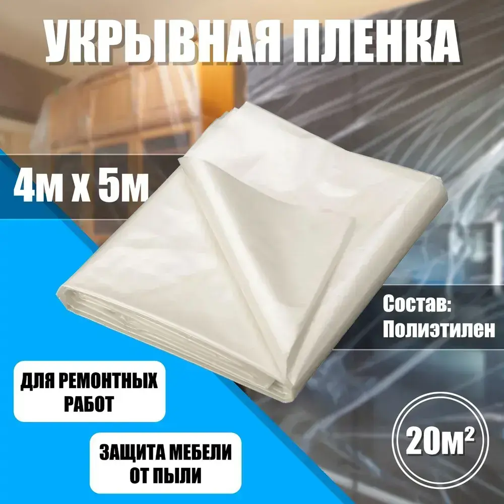 Пленка укрывная для ремонта 4 м X 5 м, 5 мкм, Защитная пленка полиэтиленовая для мебели, парника и теплиц