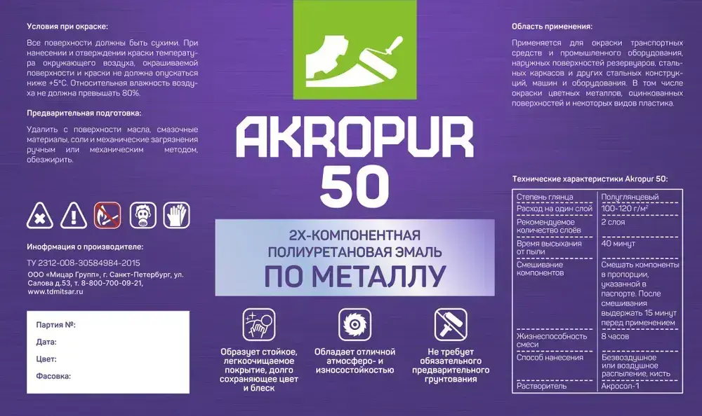 Полиуретановая эмаль Мицар АКРОПУР 50 (AKROPUR 50) для металла полуглянец 18+2кг