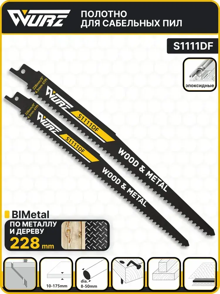Полотно универсальное S1111DF (2шт.) для сабельной пилы (биметалл) 228мм/9" 4,3мм/6TPI Wurz