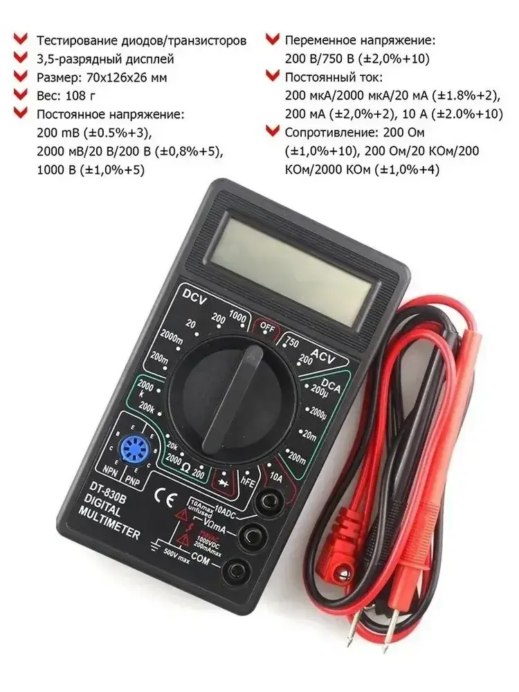 Портативный мультиметр токоизмерительный цифровой (тестер электрический), DT-830B