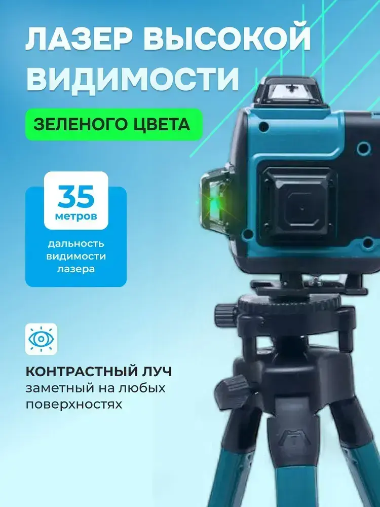 Профессиональный лазерный уровень строительный 360 4D / Нивелир, 16 ярких лучей с пультом управления и штативом, Зеленый луч 360 градусов, синий