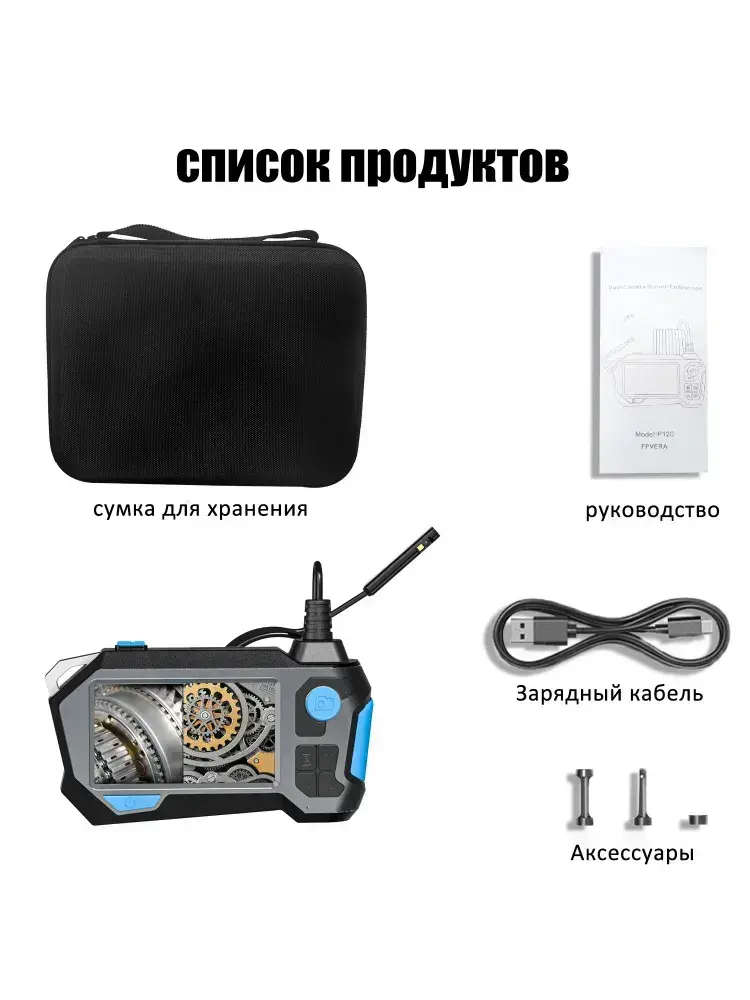 Промышленный эндоскоп HSTP P120 с двойной камерой 360 и IPS-экраном 4,5" IP68, 5 м кабель, многоязычный интерфейс