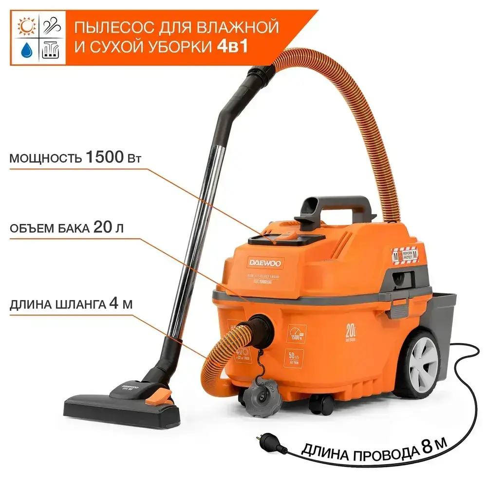 Пылесос универсальный DAEWOO HOME 1,5 кВт, 250 мбар, 20 л