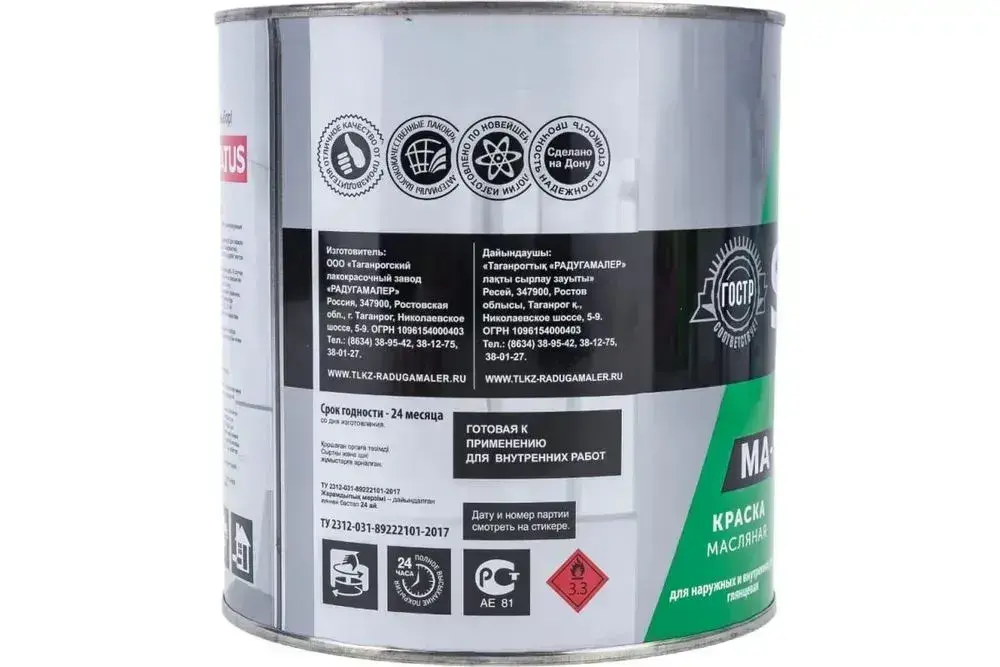 РАДУГАМАЛЕР Краска Гладкая, до 60°, Масляная, Глянцевое покрытие, 1.8 кг, белый
