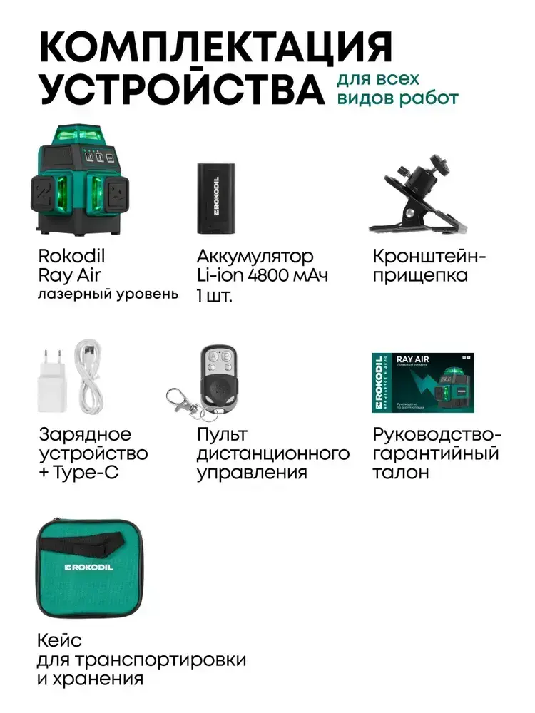 Rokodil / Компактный лазерный уровень 3D, зеленый луч SHARP / RAY AIR, 12 линий, самовыравнивание, аккумулятор на 10 ч, дальность 30 м, максимальная комплектация с пультом и креплением-прищепкой