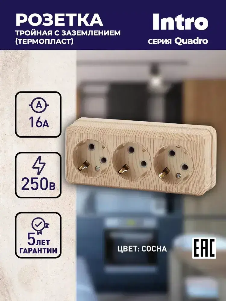 Розетка Intro Quadro 2-206-11 с заземлением трехместная 3х2P+E 16А-250В IP20 открытой установки сосна