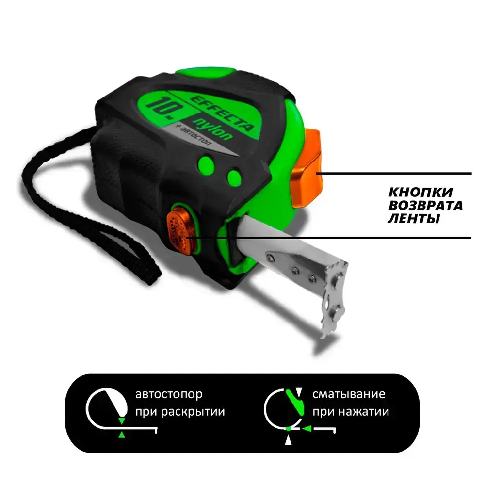 Рулетка EFFECTA NYLON 10м х 25мм, с магнитом, с автостопом, нейлоновое покрытие, ударостойкая с резиновым покрытием, 2 класс точности