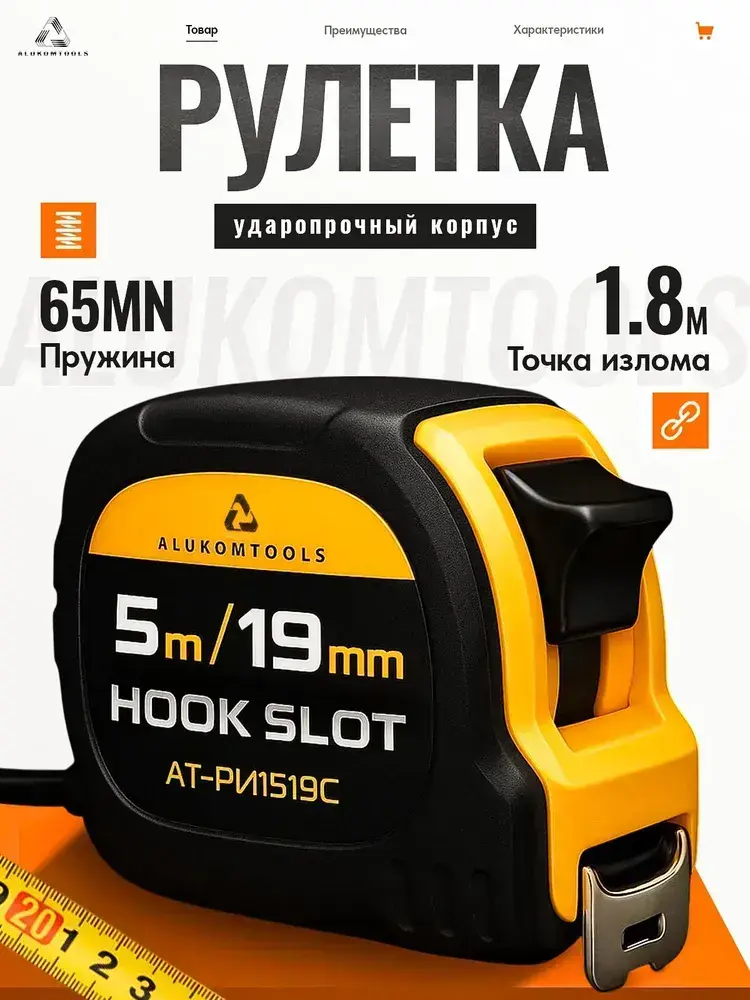 Рулетка строительная измерительная, 5 м х 19 мм, две кнопки фиксации