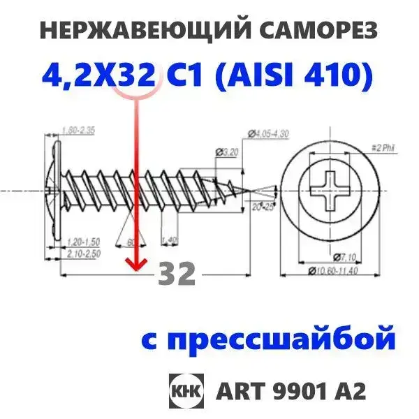 Саморез нержавеющий 4,2х32 с прессшайбой остроконечный КНК, нерж сталь, клоп Li, 10 шт.