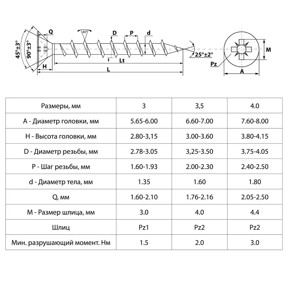 Саморез по дереву (шуруп) 3,5х16 мм, потайная головка, крестообразный шлиц PZ2, 500 шт