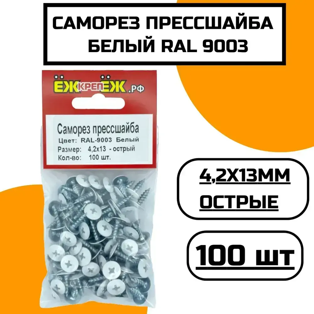 Саморез прессшайба 4,2х13мм острый Белый RAL-9003 (100 шт.) ЁЖкрепЁЖ.