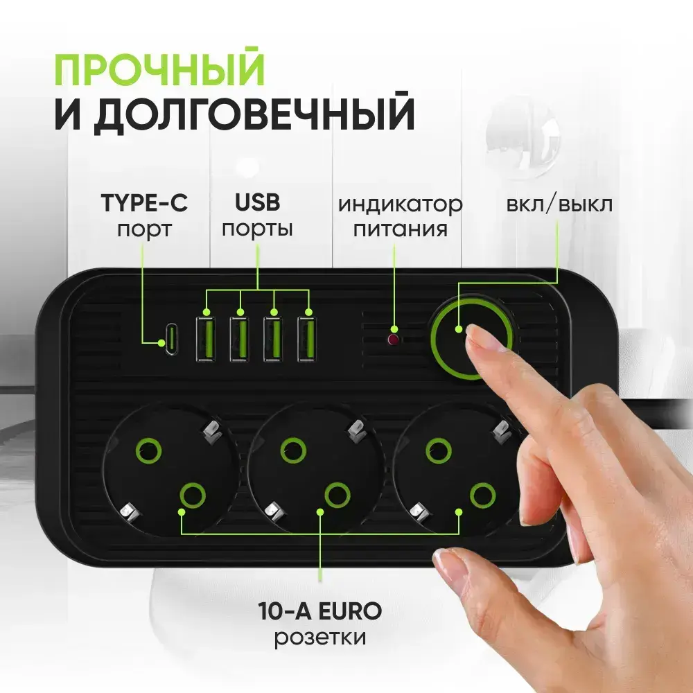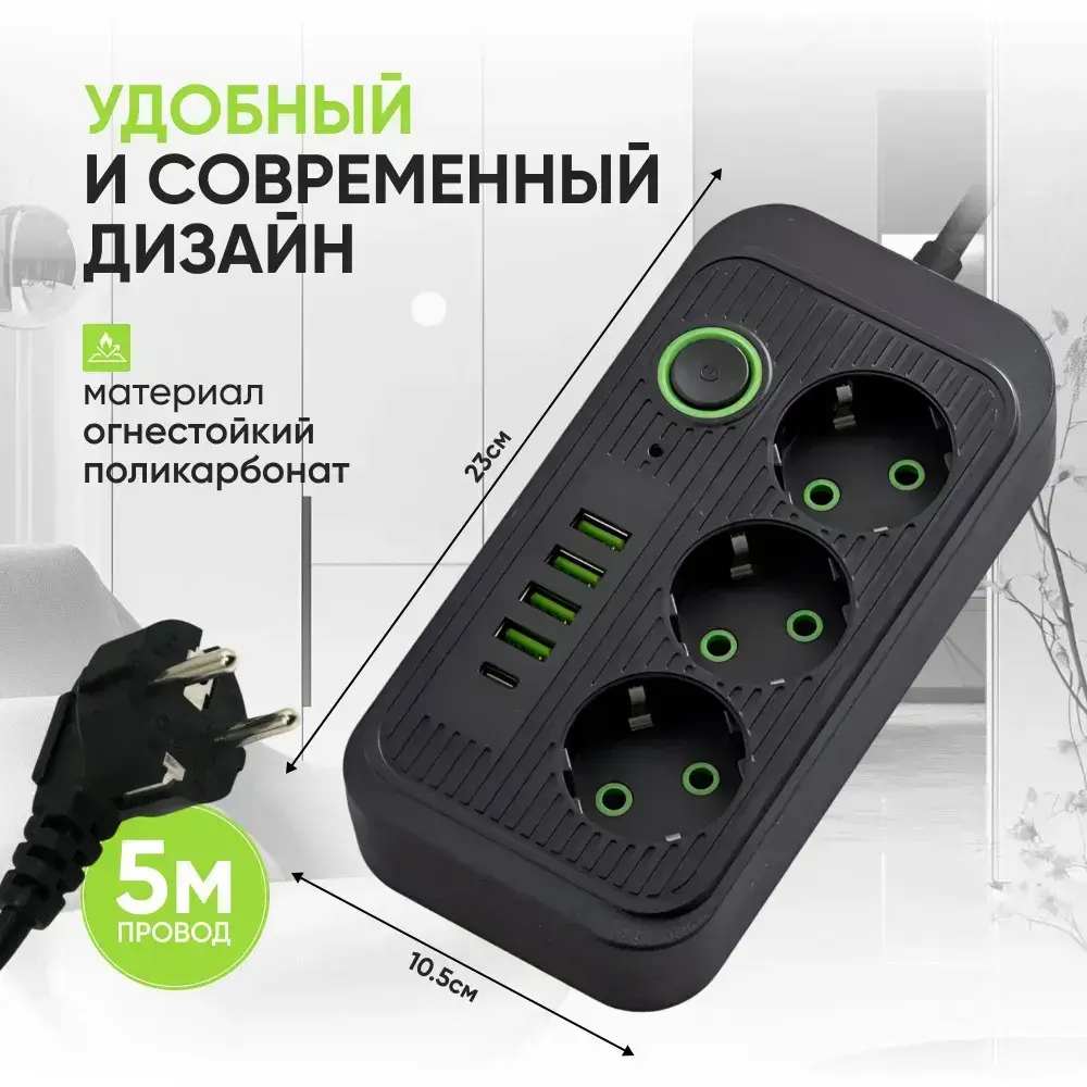 Сетевой фильтр 5 метров, на 3 розетки, удлинитель с usb пилот с type-c черный