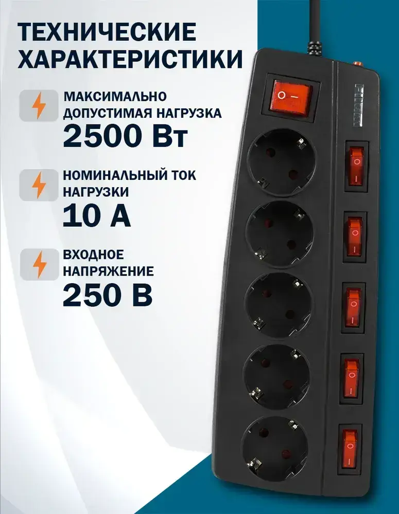 Сетевой фильтр Filum FL-SPL5-1.8M-BL, 5 розеток с индивидуальным выключателем,термопредохранитель, двухполюсный выключатель, защитные шторки, кабель 1.8 м., черный