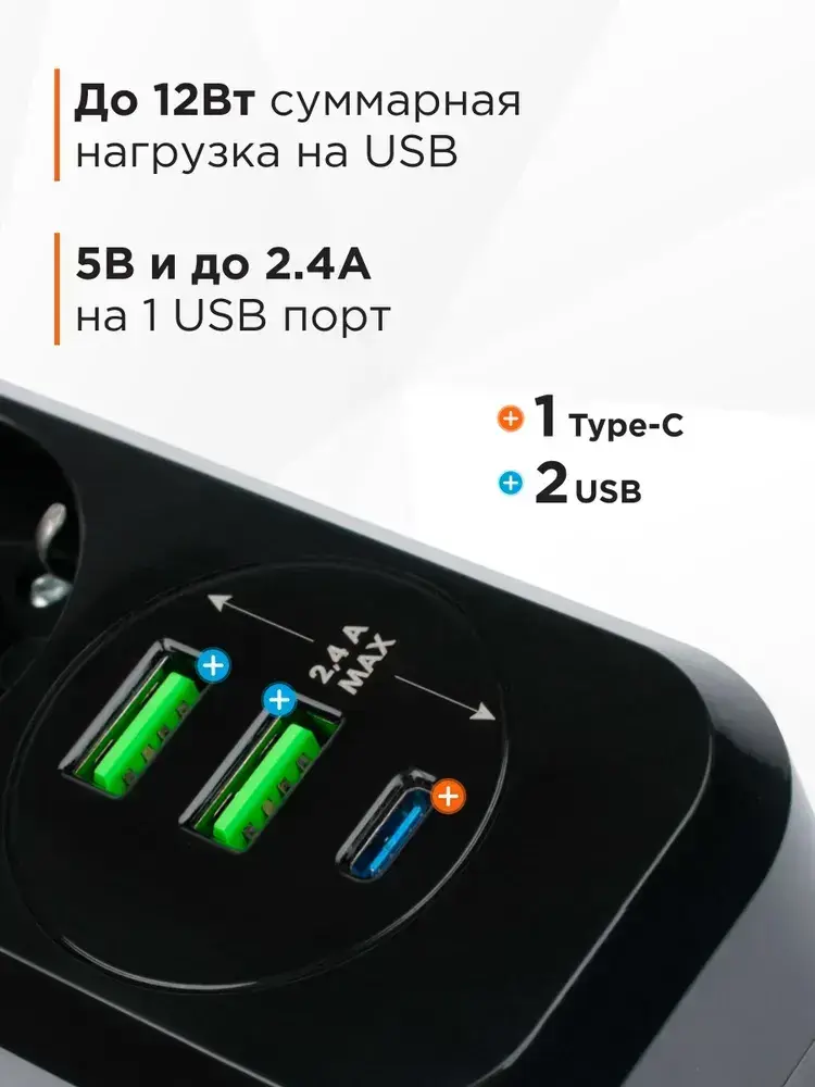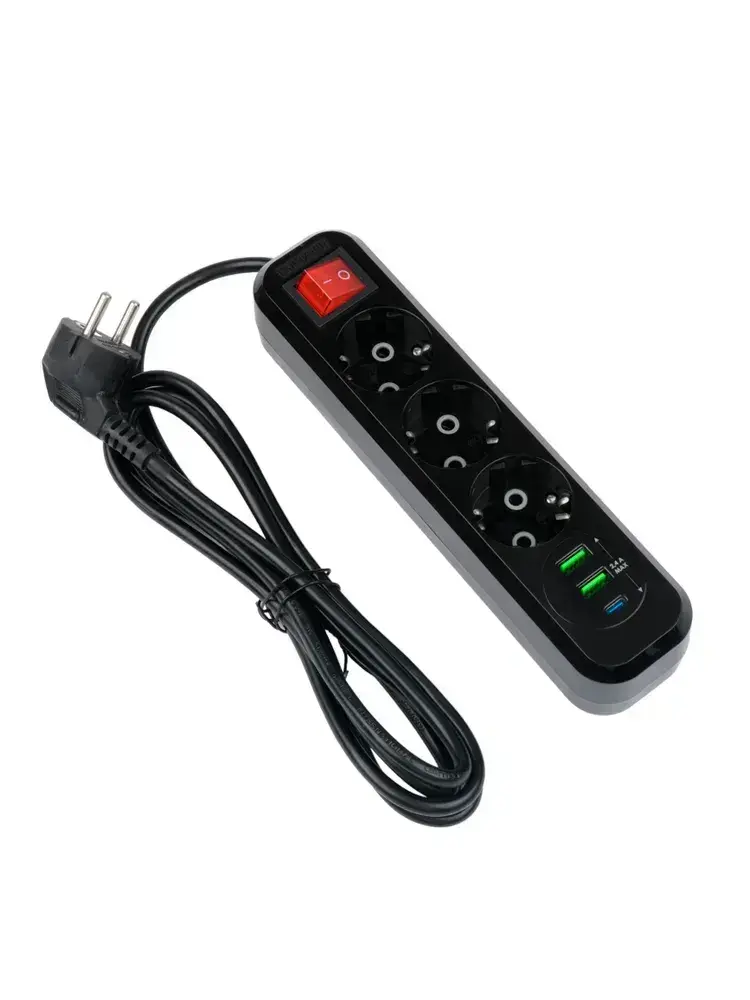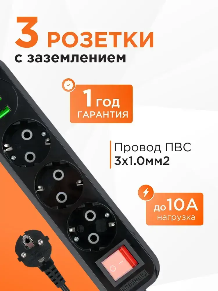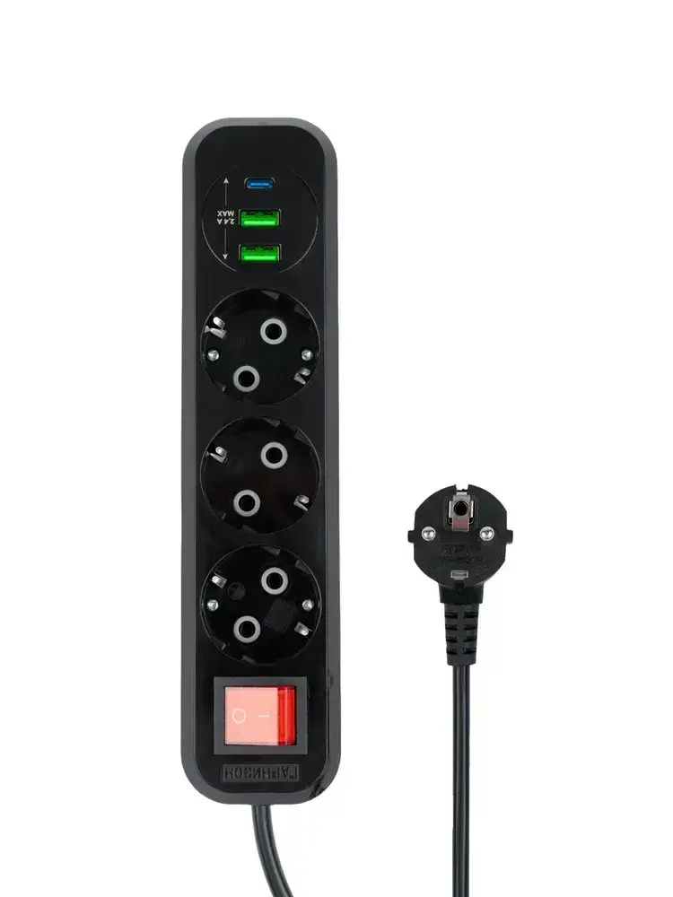 Сетевой фильтр Гарнизон с базовой защитой с заземлением с выключателем 3 розетки, 10A, 1xType-C, 2xUSB, 2 метра, черный