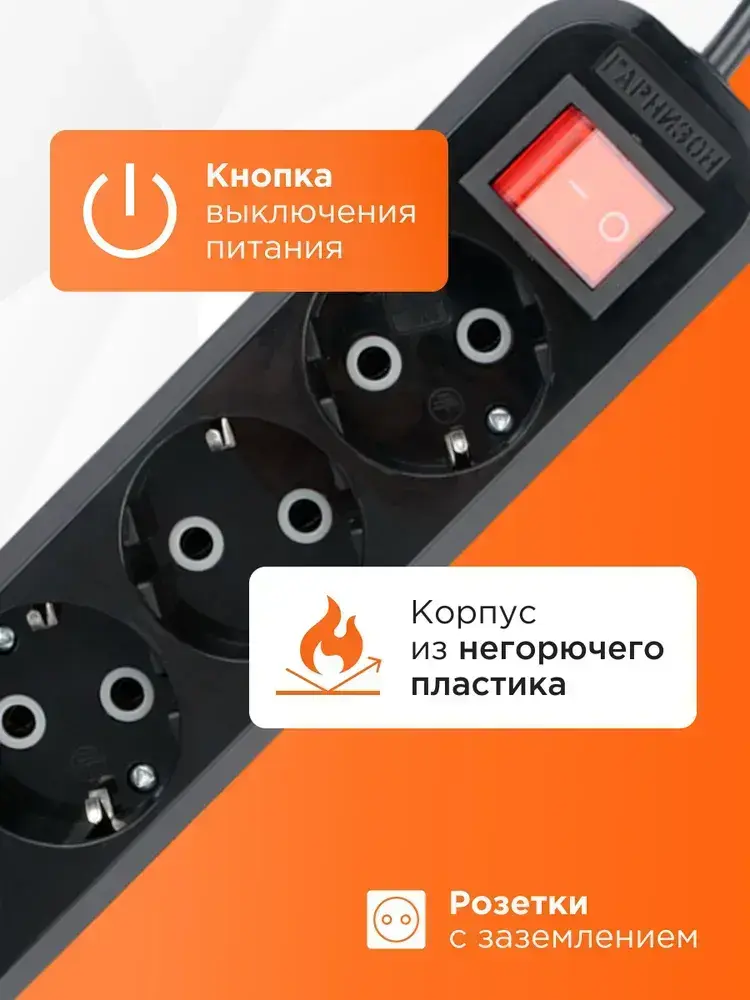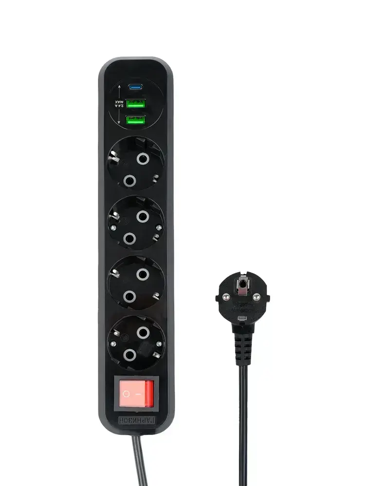 Сетевой фильтр Гарнизон с базовой защитой с заземлением с выключателем 4 розетки , 10A, 1xType-C, 2xUSB, 3 метра, выключатель и заземление, черный