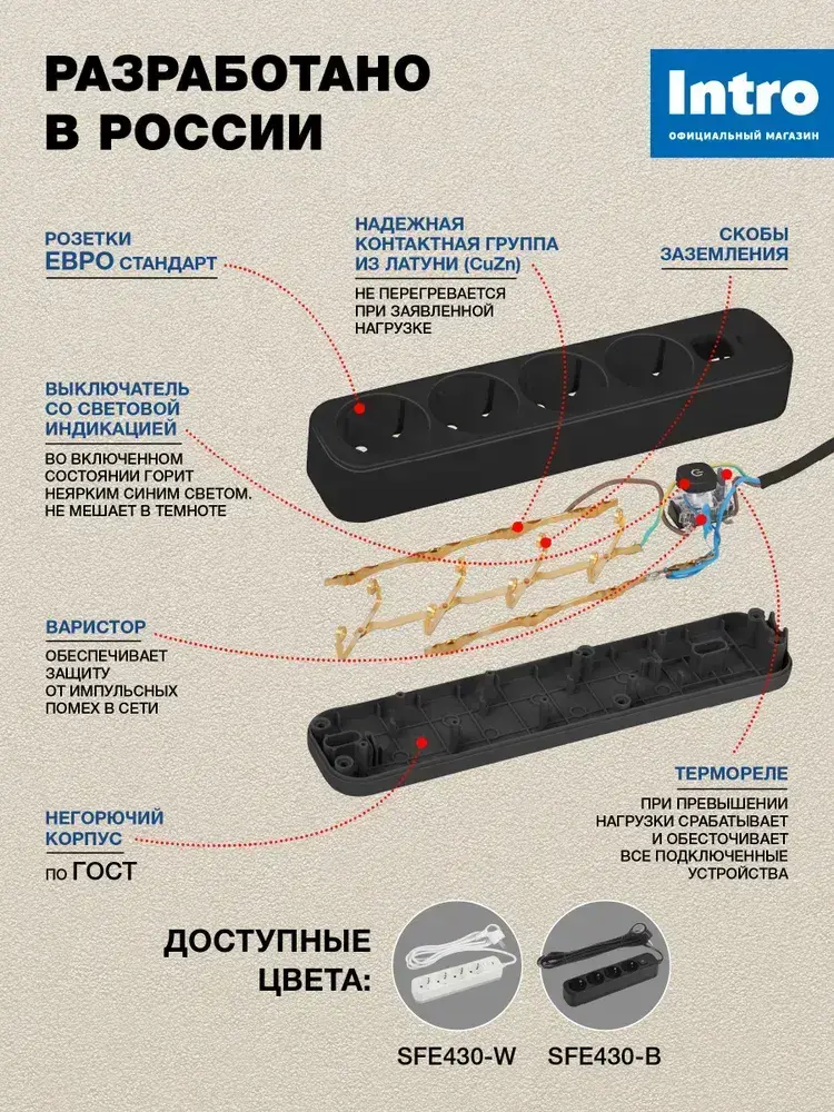 Сетевой фильтр Intro SFE430-B с базовой защитой с заземлением с выключателем 4 розетки 3м 10А черный / удлинитель сетевой 3м