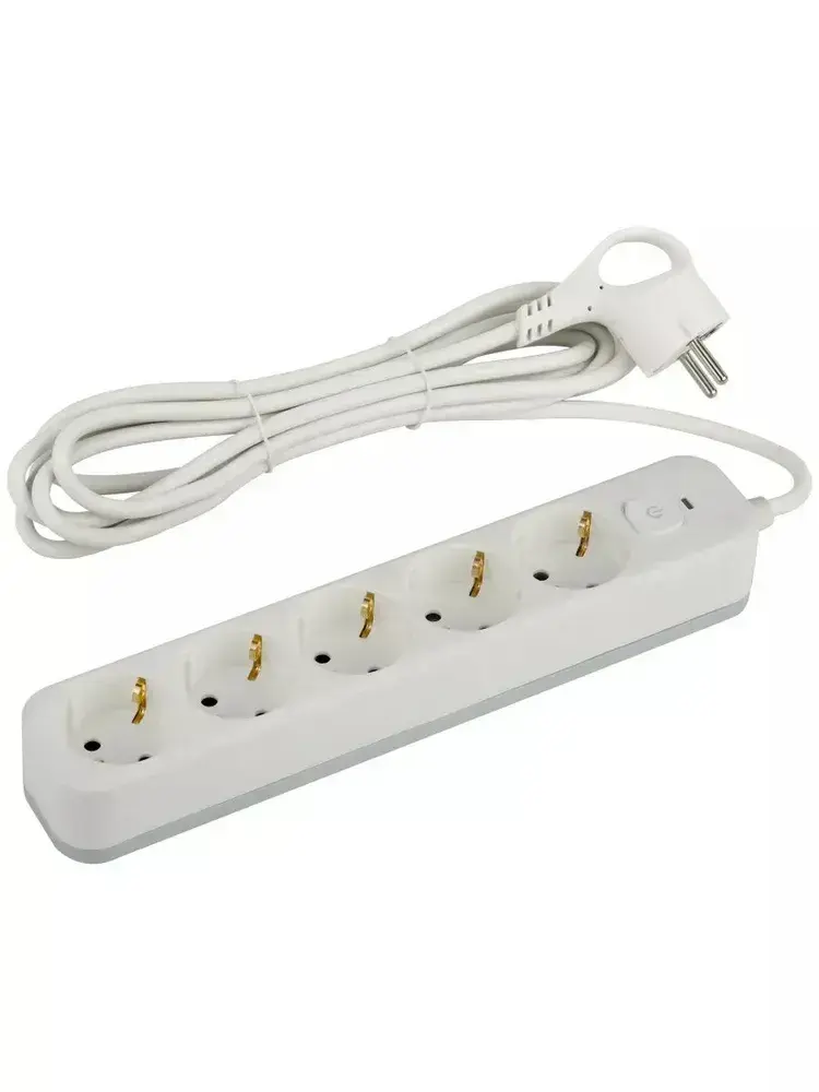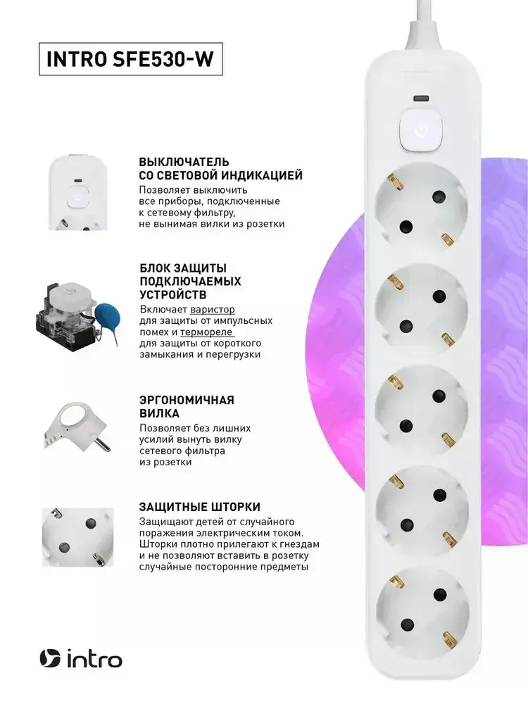 Сетевой фильтр Intro SFE530-W с базовой защитой с заземлением с выключателем 5 розеток 3м 10А белый / удлинитель сетевой 3м