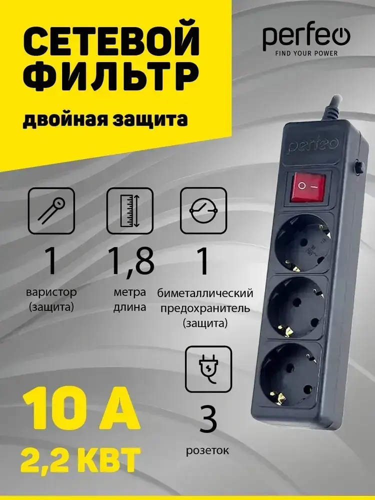 Сетевой фильтр Perfeo POWER+ 1,8м, 3 розетки, черный (PF-PP-3/1,8-B)