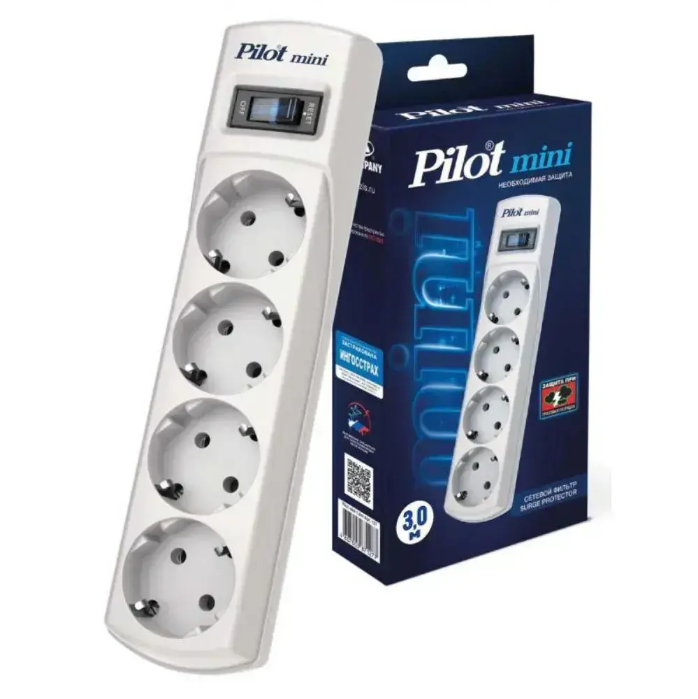 Сетевой фильтр PILOT Mini, 4-розетки, 3м, светло-серый