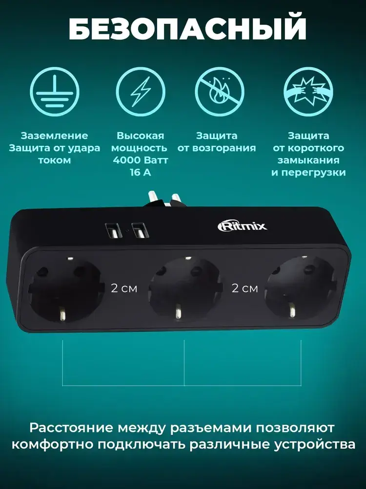 Сетевой фильтр RITMIX RM-032 Black, 3 розетки, 2 USB порта, 16А, 4000 Вт