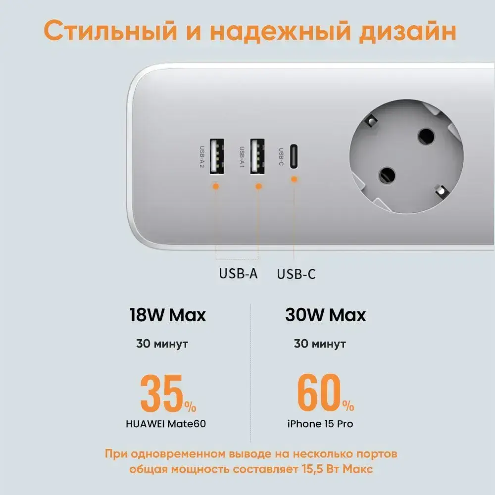Сетевой фильтр (удлинитель) UGREEN CD286 (25357) с розетками 30W 3AC Power Strip with Master Switch (2A1C) EU. Цвет: белый