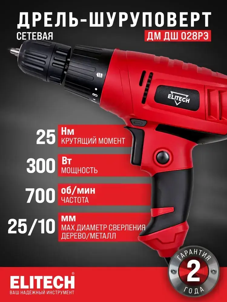 Шуруповерт сетевой Elitech ДМ ДШ 028РЭ, дрель-шуруповерт сетевая 300Вт, 25Нм максимальный крутящий момент