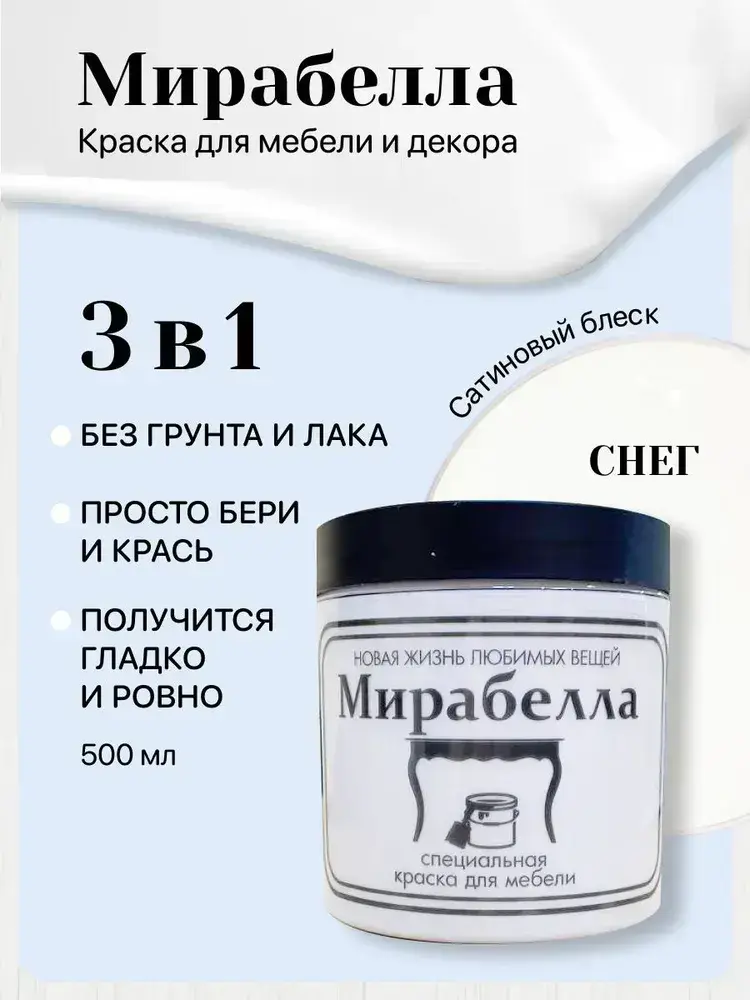 Специальная краска для перекраски мебели Мирабелла Сатин, Снег, 500 мл, быстросохнущая, на водной основе, без запаха, полуматовое покрытие, капельно-белый