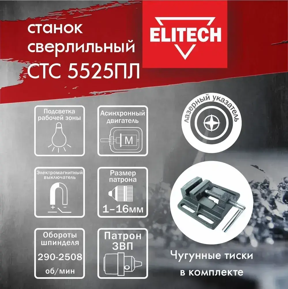 Станок сверлильный ELITECH СТС 5525ПЛ (550Вт., 12 скоростей, лазерный указатель, стол чугун, тиски 65 мм) 186130