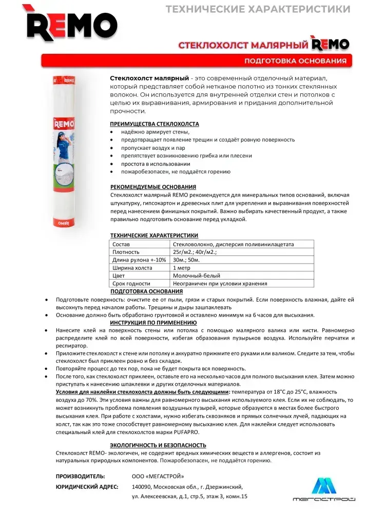 Стеклохолст малярный паутинка REMO 40гр/м2 50 м.