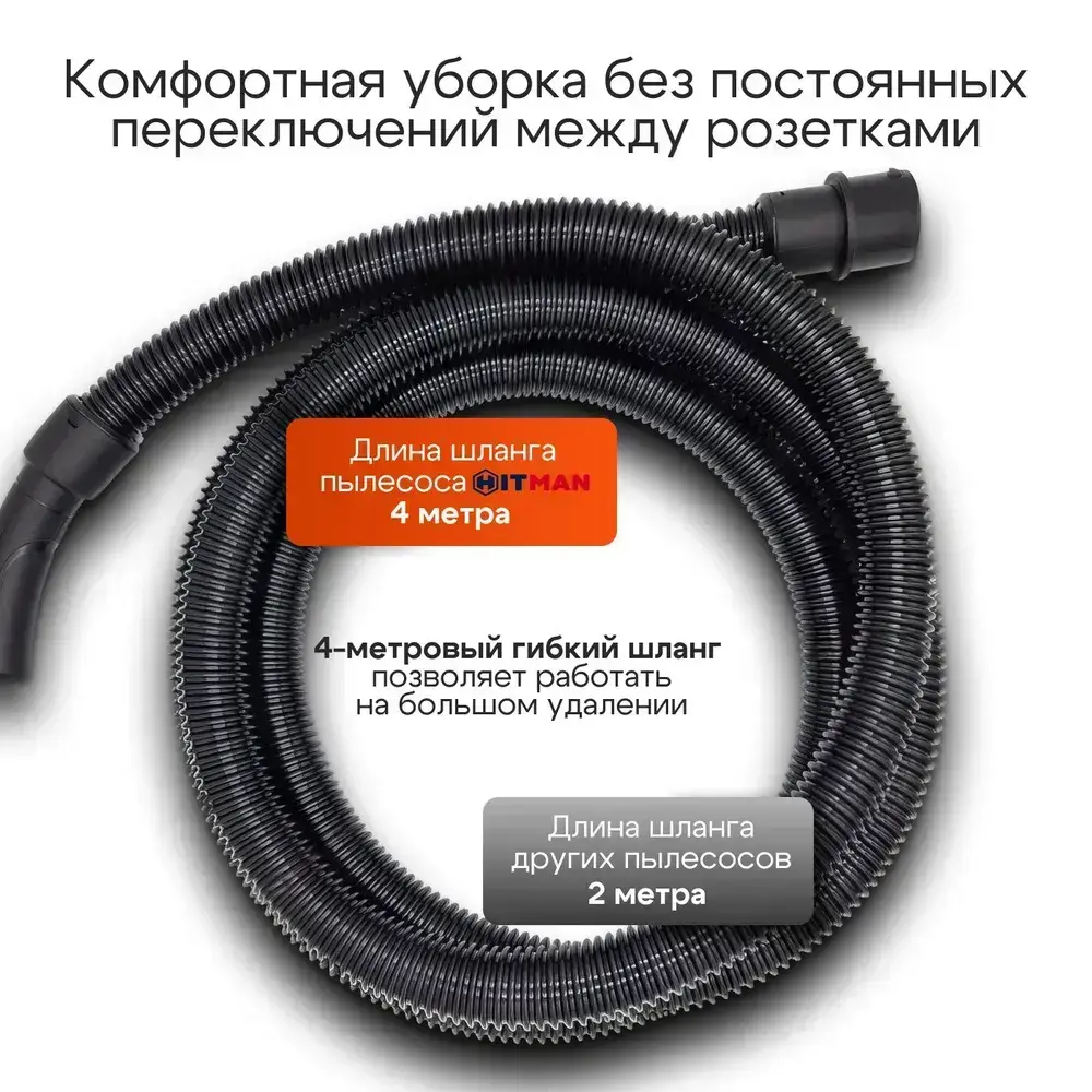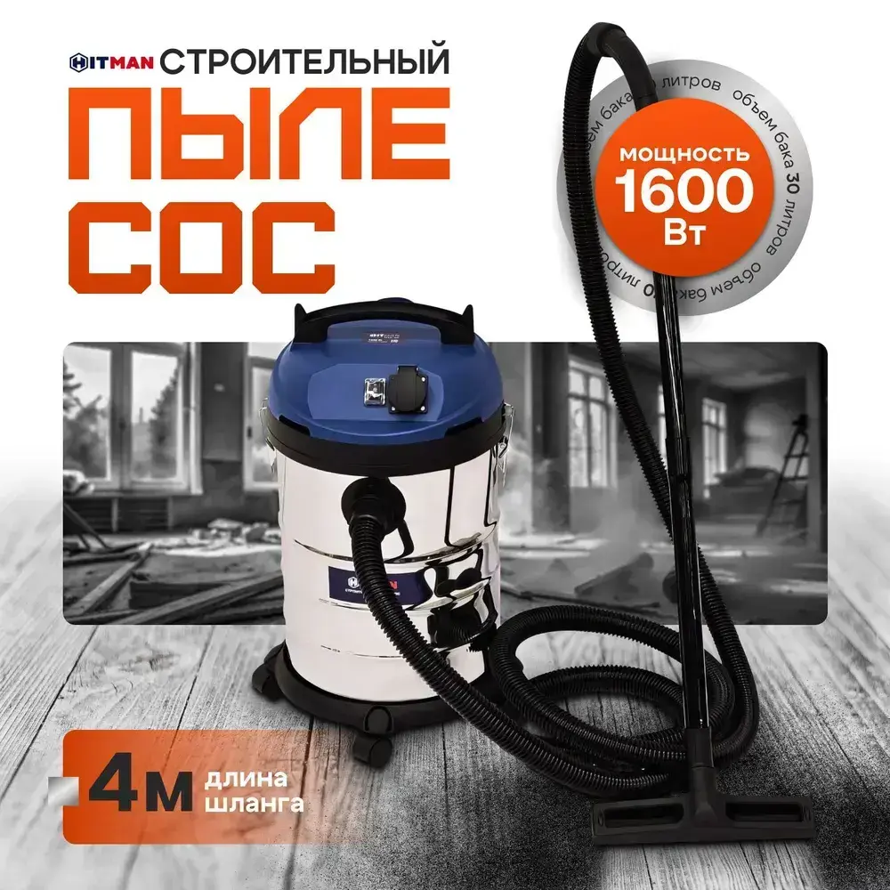 Строительный пылесос, промышленный, электрический Hitman( 1600 Вт, 30 литров,сухая/влажная уборка )