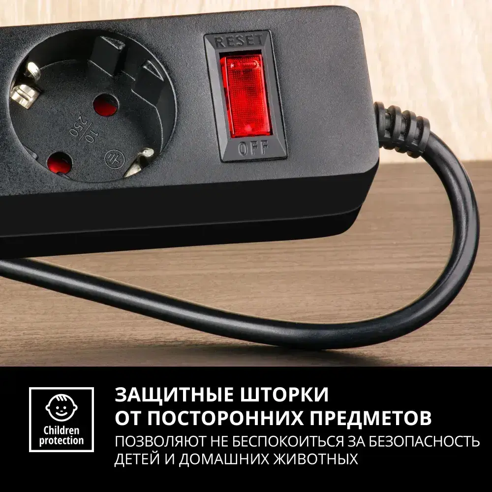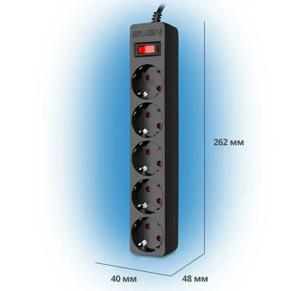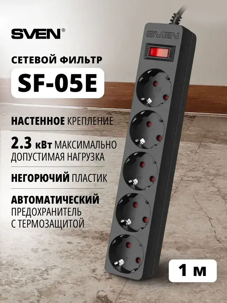 SVEN SF-05E Сетевой фильтр, 1 м / Удлинитель с настенным креплением - 5 розеток, черный