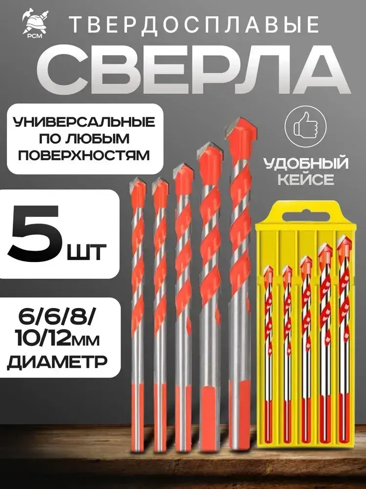 Сверла универсальные 5 шт. (6-6-8-10-12мм) по стеклу, керамограниту, мрамору, бетону, металлу, пластику, дереву