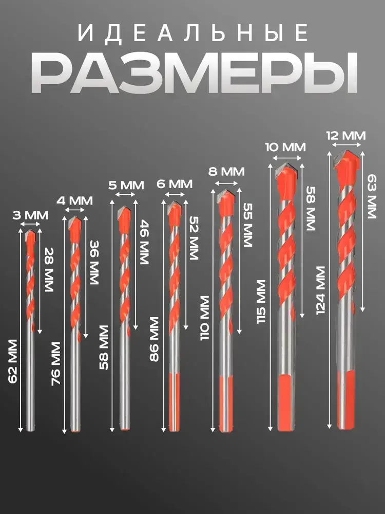 Сверла универсальные 7 шт. (3-4-5-6-8-10-12мм) по стеклу, керамограниту, мрамору, бетону, металлу, пластику, дереву