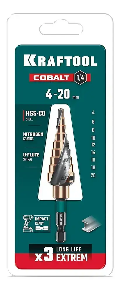 Сверло ступенчатое 9 ступеней, азотирование, винтовая спираль, KRAFTOOL COBALT 4-20мм, 29691-4-20-9