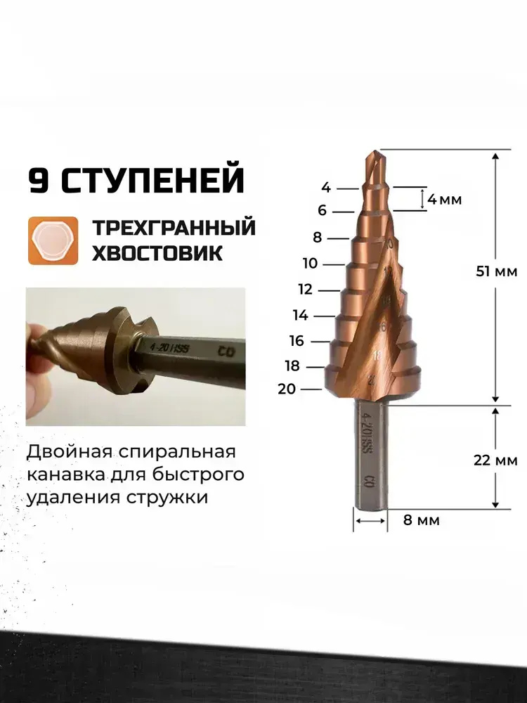 Сверло ступенчатое по металлу кобальтовое 4-20мм конусное