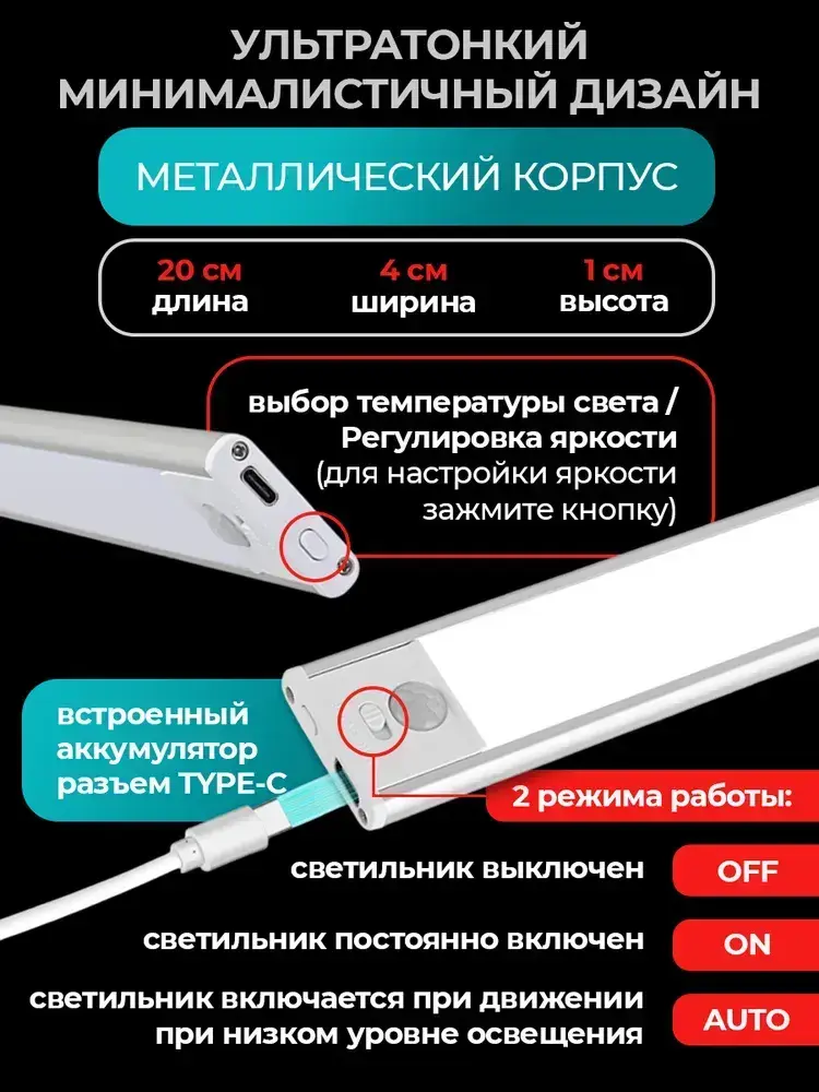 Светильник 20 см с датчиком движения беспроводной аккумуляторный, на магнитах, на кухню, в шкаф
