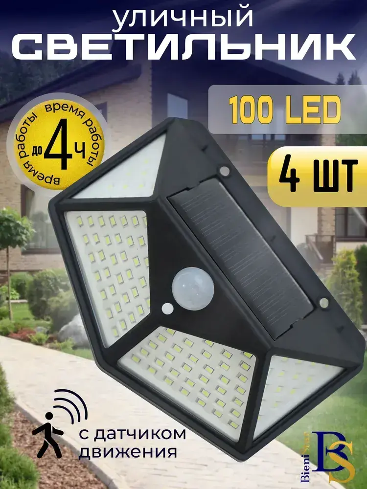 Светильник на солнечной батарее уличный светодиодный беспроводной аккумуляторный . Прожектор с 100 LED лампами и датчиком движения для дома, дачи. Комплект 4 шт.