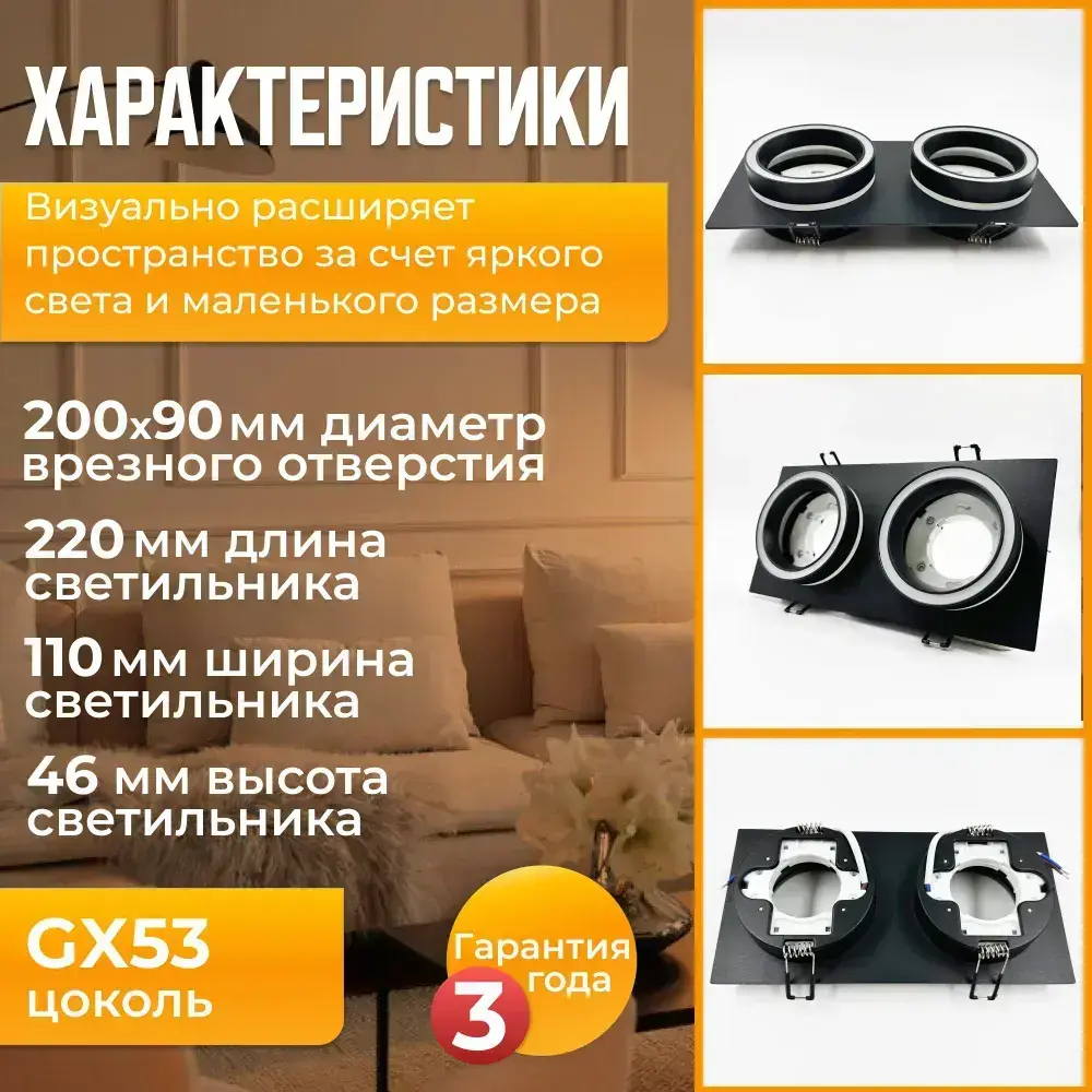 Светильник потолочный встраиваемый GX5.3 двойной, спот точечный черный светодиодный