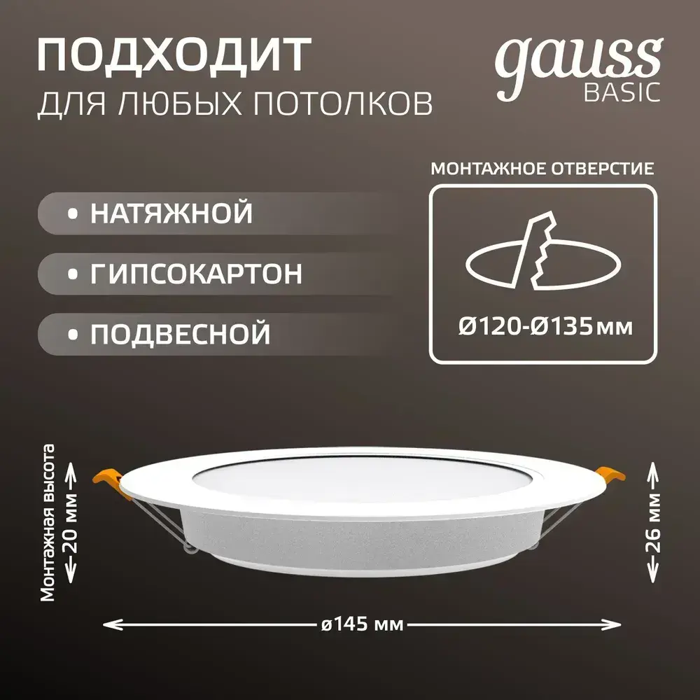 Светильник потолочный встраиваемый круг 12W 4000K IP20 145*26 белый Downlight Gauss Basic
